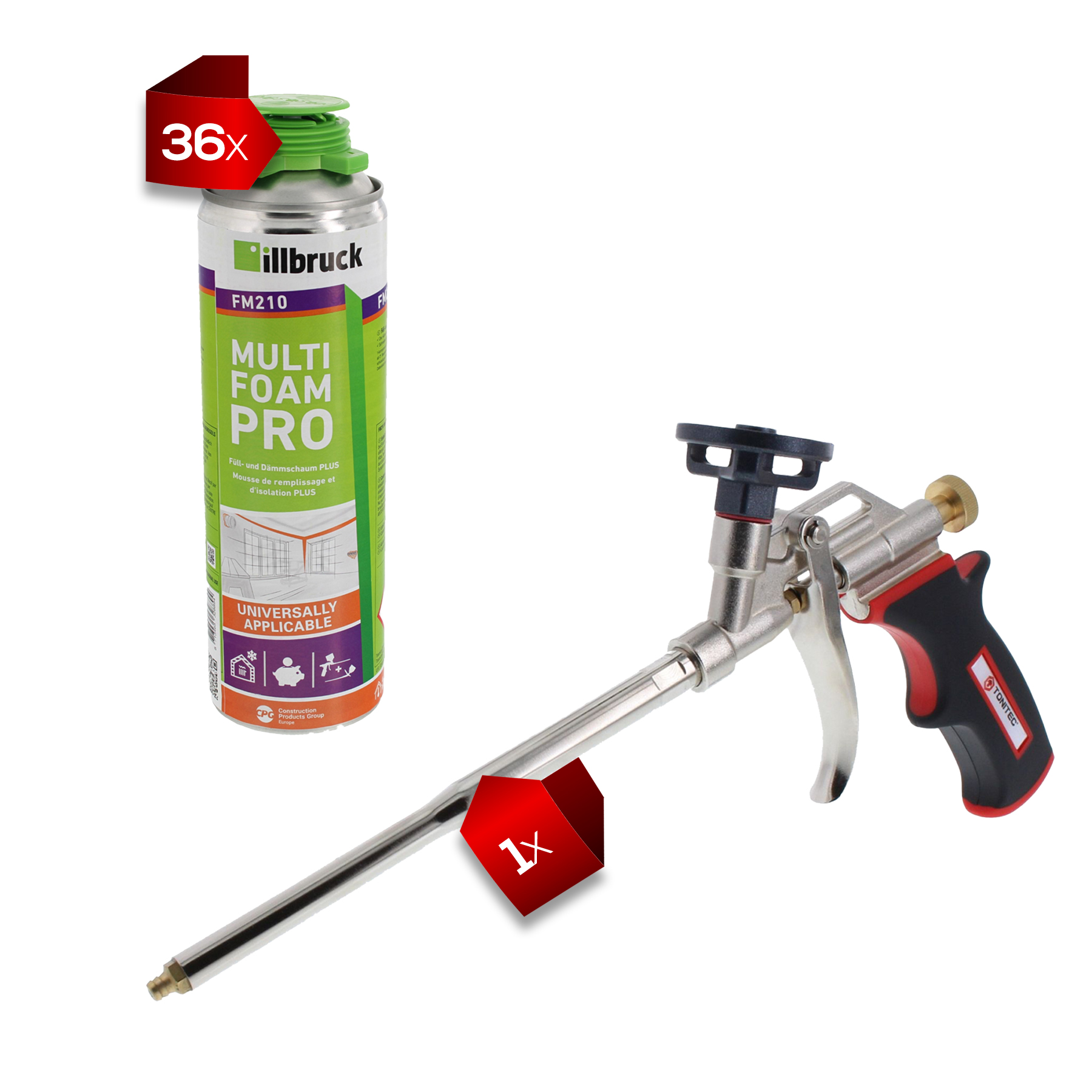 Das Set besteht aus 36 Dosen illbruck FM210 Fenster- und Fassadenschaum (500 ml, 1K PUR) sowie einer ToniTec Schaumpistole PLUS. Es eignet sich für professionelle Abdichtungs- und Montagetätigkeiten rund um Fenster, Türen und Fassaden.