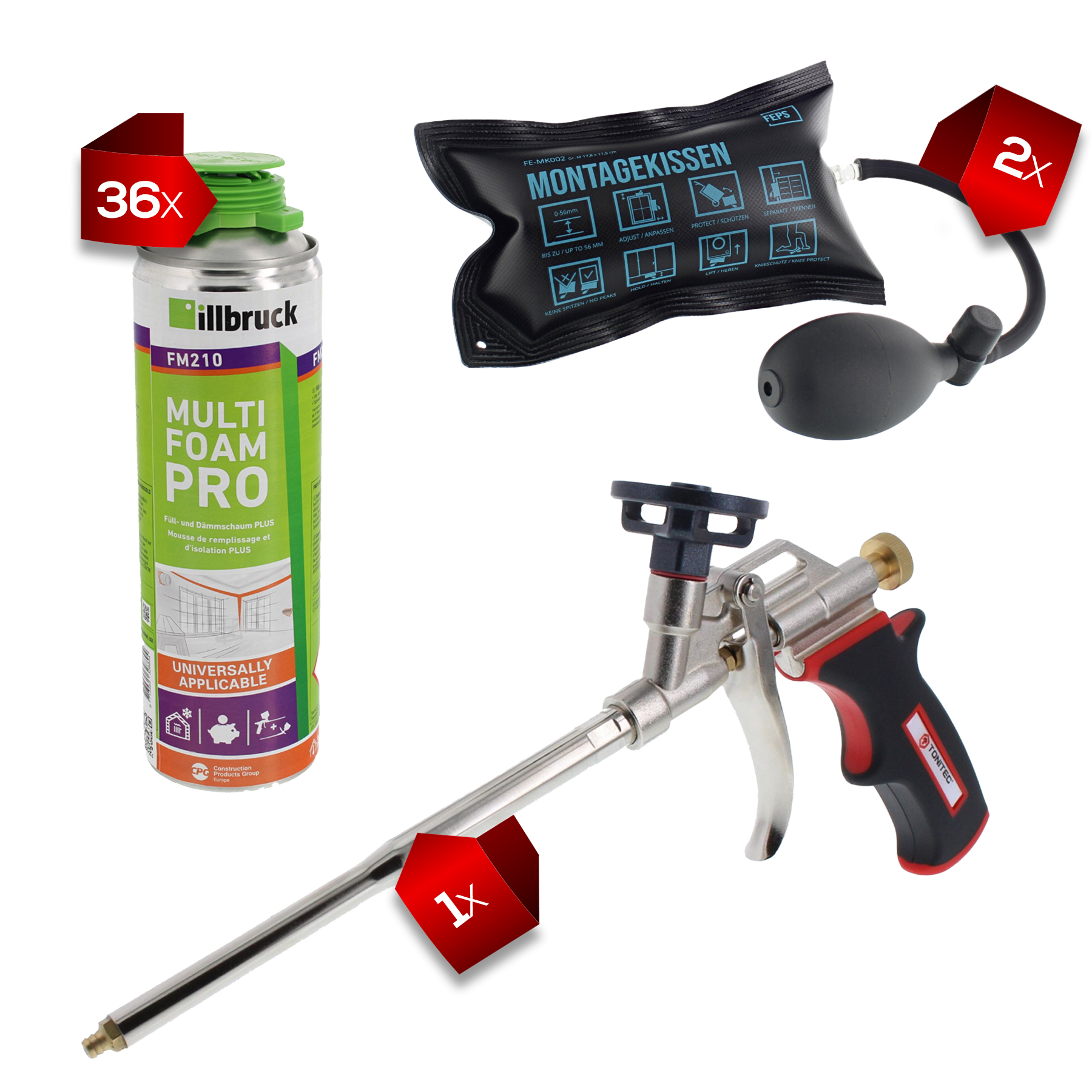 Dieses Set besteht aus 36 Dosen illbruck FM210 Fenster- und Fassadenschaum (500 ml, 1K PUR Schaum), zwei FEPS Tool Montagekissen der Größe M (178x115 mm, schwarz) sowie einer ToniTec Schaumpistole Dosierpistole PLUS. Es eignet sich für professionelle Abdichtungs-, Montage- und Ausrichtarbeiten rund um Fenster, Türen und Fassaden.