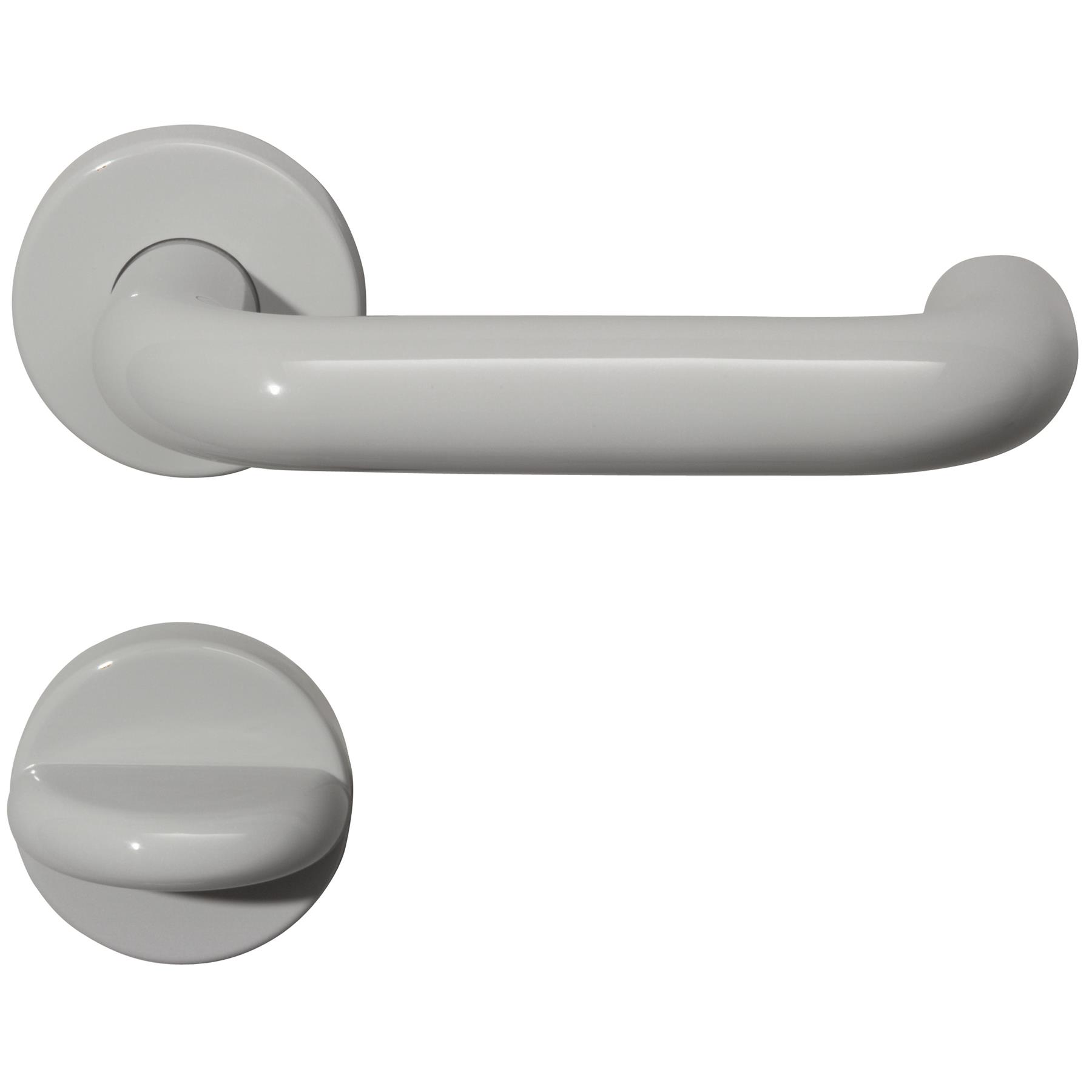 - Bauart: Drückergarnitur mit WC-Rosetten (Not- und Frei-Funktion)