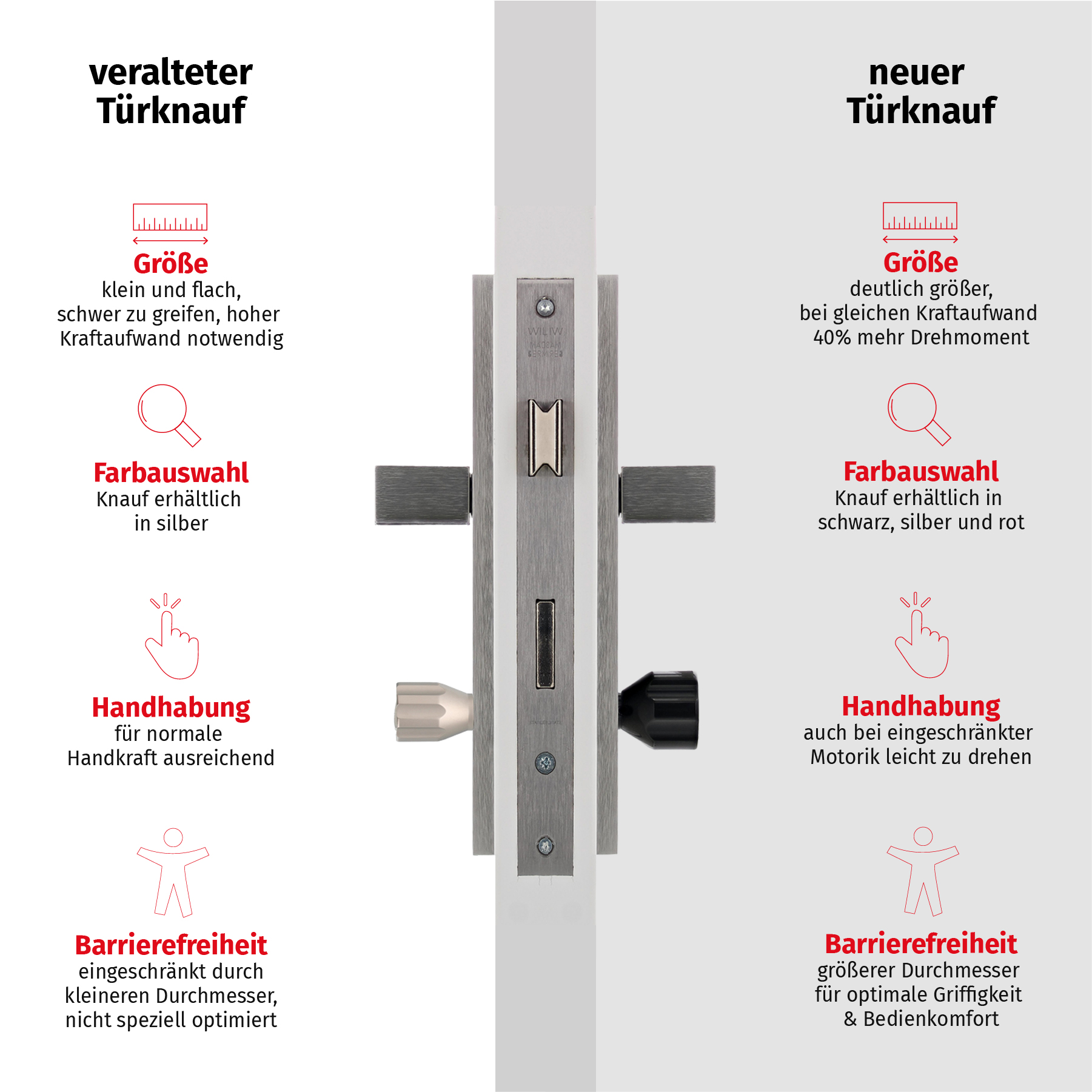 - Mehr Drehmoment: Der vergrößerte Knauf ermöglicht bei gleichem Kraftaufwand etwa 40 % mehr Drehmoment, wodurch sich Türen merklich leichter auf- und zuschließen lassen.