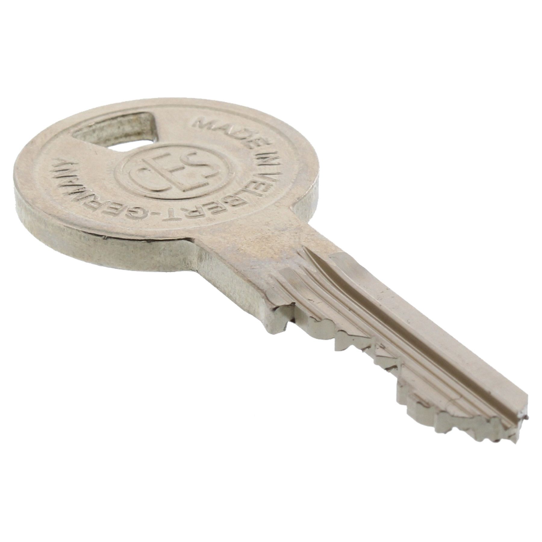 - Stabiler Neusilberschlüssel mit patentierter Spitze und mindestens 14 mm langem Schlüsselhals